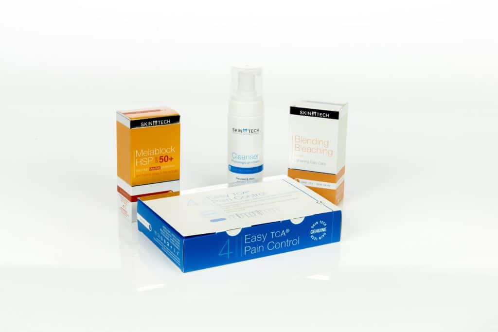 Tijdens de kuur gebruik je thuis specifieke behandelcrèmes en een gezichtsreiniger van SkinTech®. Deze behandelcrèmes zijn speciaal ontwikkeld voor aanpak van bepaalde huidproblemen (zoals pigmentvlekken, acne, fijne lijntjes en littekentjes, droge, arme of vale huid) en voor bescherming van je huid tegen zonlicht (uv) en warmte (Melablock HSP® SPF 50+).